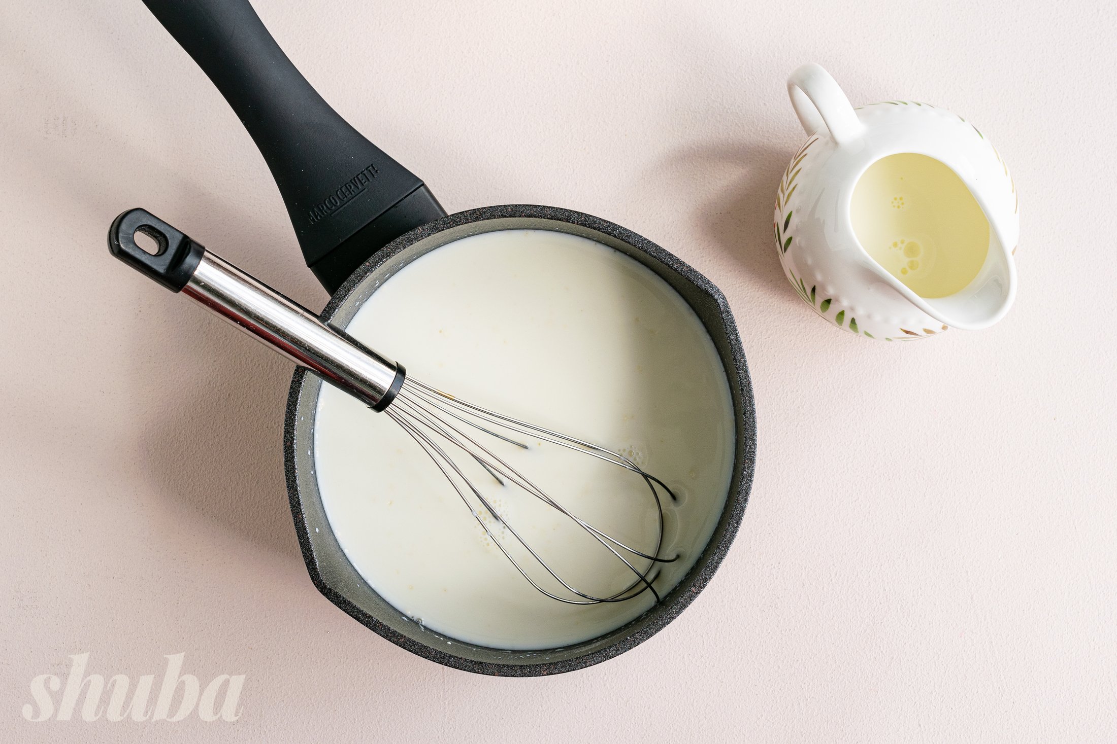 Влий невелику кількість молока та добре перемішай вінчиком, щоб не залишилося грудочок. Додай решту молока, перемішай до однорідної консистенції.