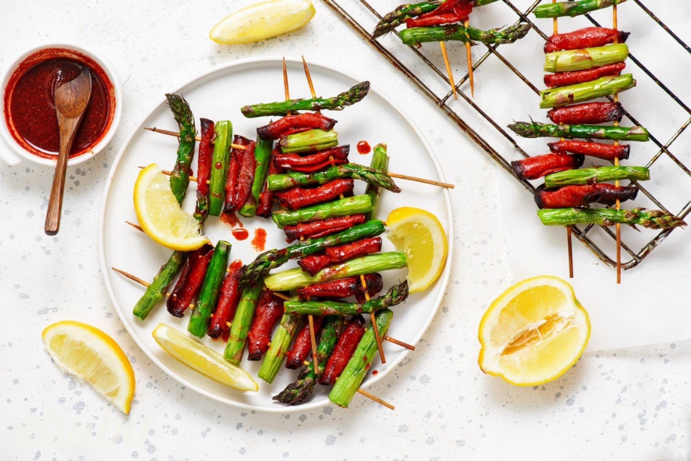 Шашлички зі спаржею та ковбасою — це ідеальний вибір для пікніка який готується за хвилини. Спаржа під час обсмажування залишається ніжною всередині й трохи хрусткою, а чорізо додає насичений, пряний смак. Медово-паприкова глазур легко карамелізує, а лимон освіжає і балансує всю страву. Це ще одна з ідей для грилю, спробуй!