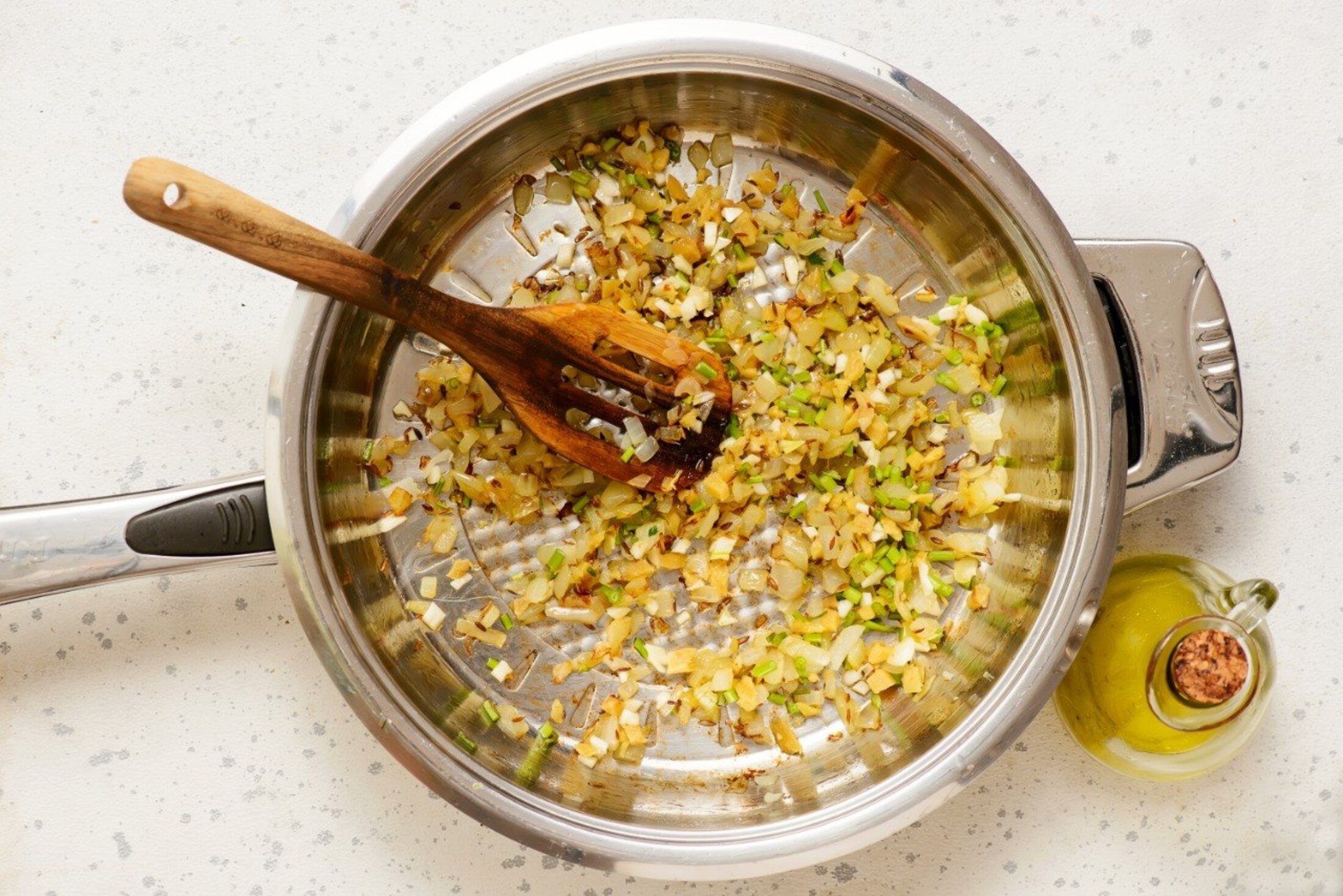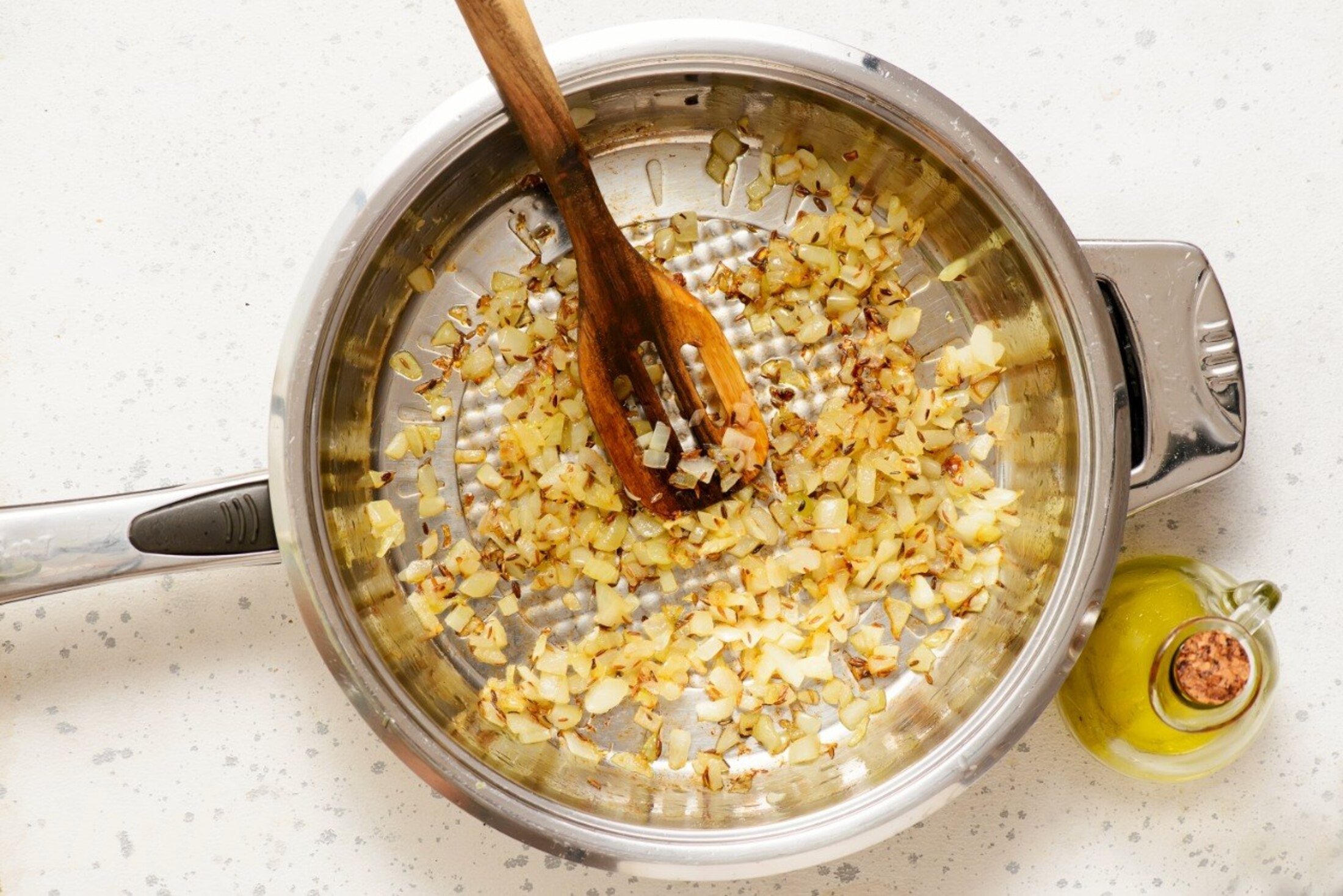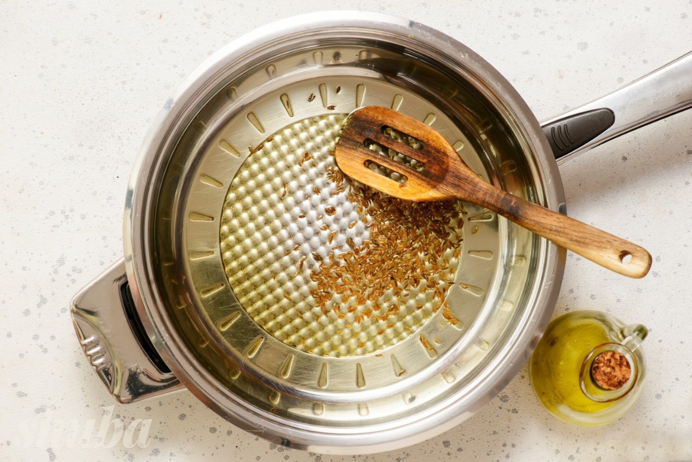 Розігрій олію в глибокій каструлі й обсмаж кмин приблизно 1 хвилину до появи аромату.