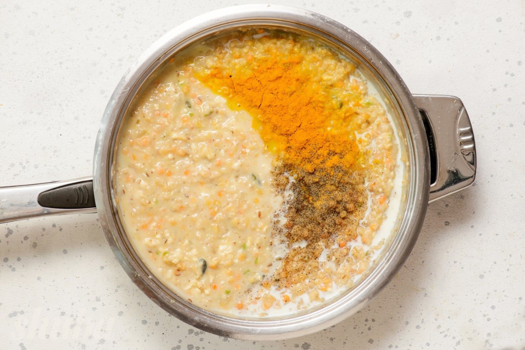 Зніми з плити, додай куркуму, сіль, перець і рослинне молоко, добре перемішай.
