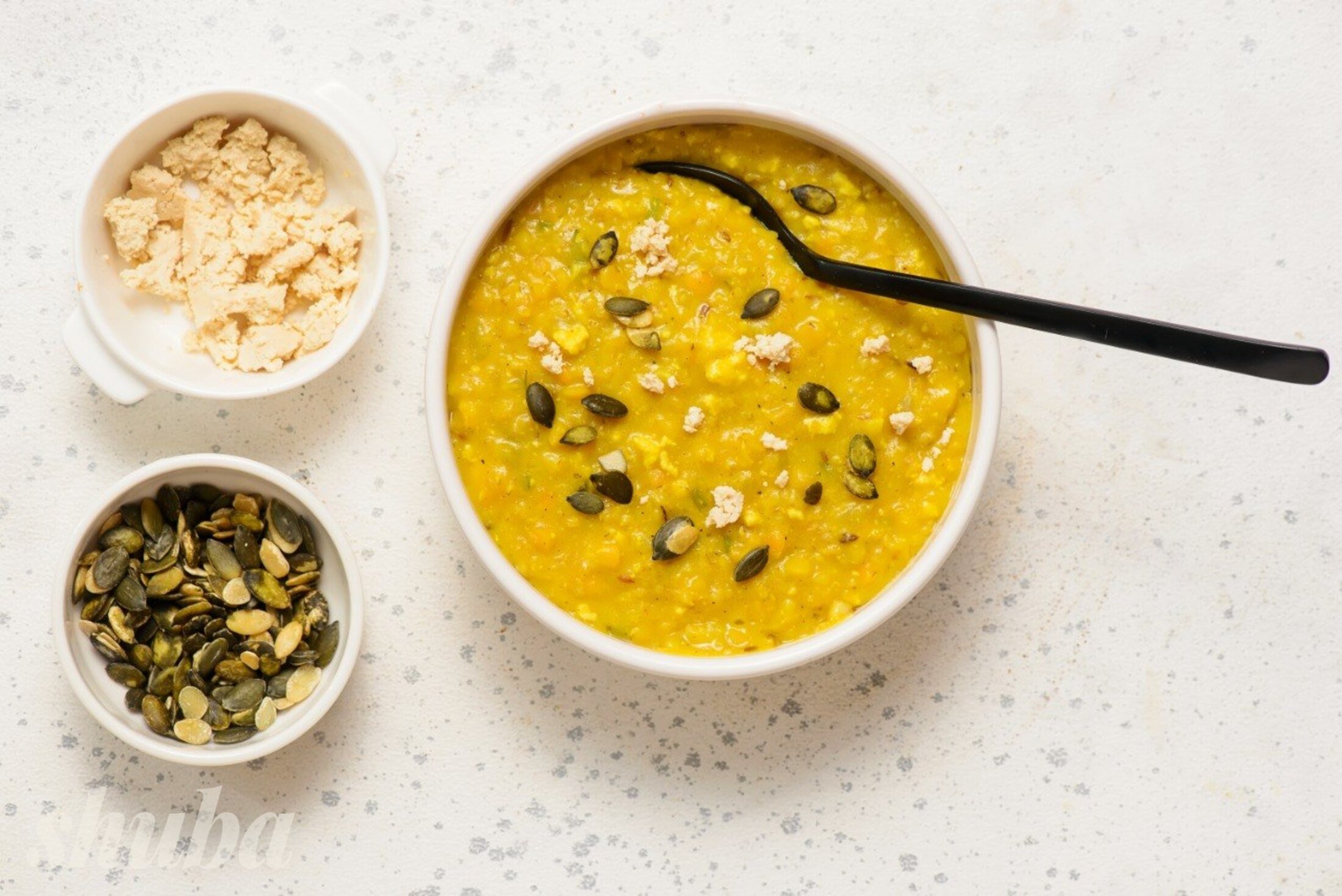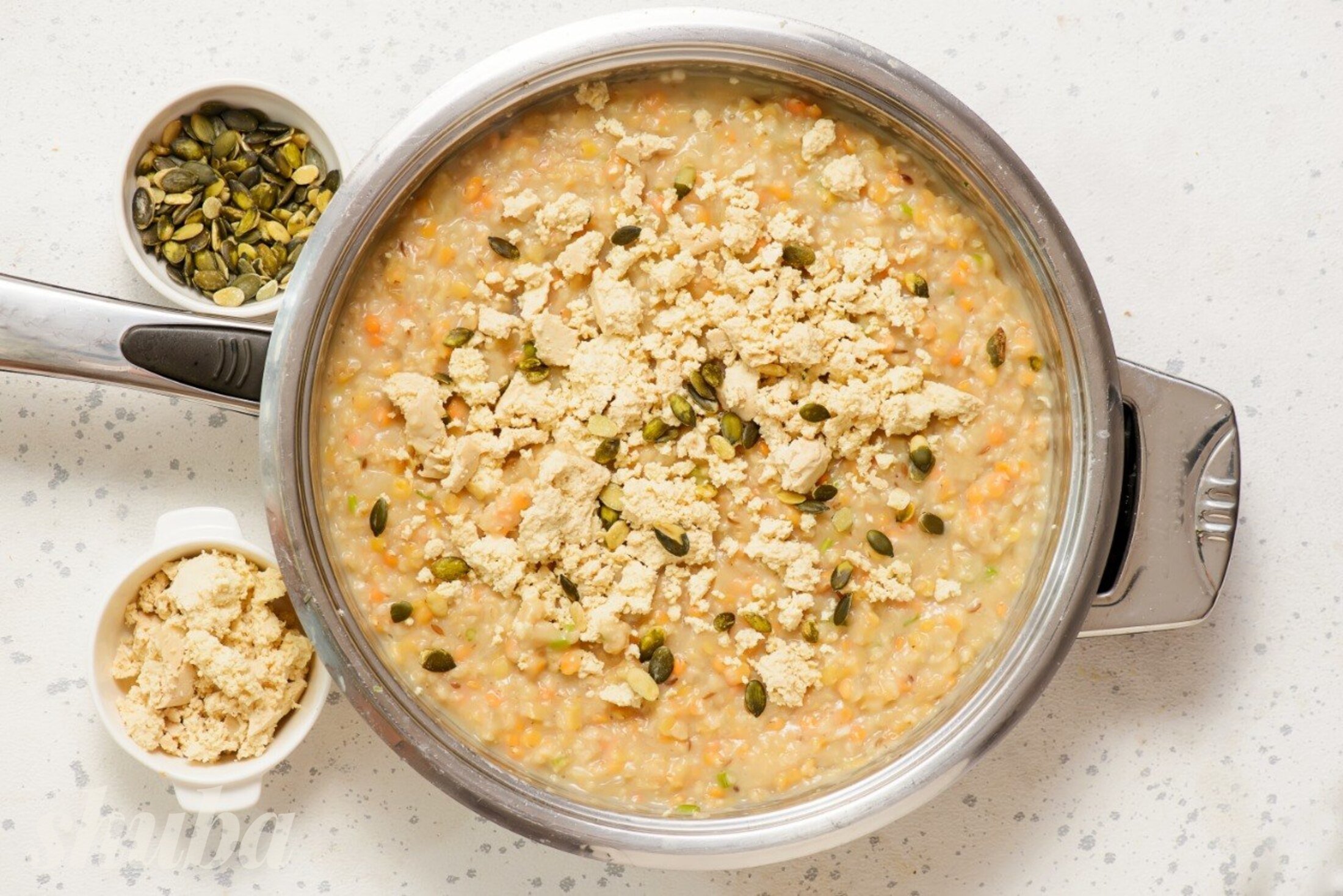Сочевиця вариться швидко та легко розварюється, але це нормально, саме так формується кремова текстура. А солона вівсянка робить цю страву ніжнішою та об’ємнішою. Тофу краще не різати, а саме розминати — так він рівномірно розподіляється і краще вбирає спеції.