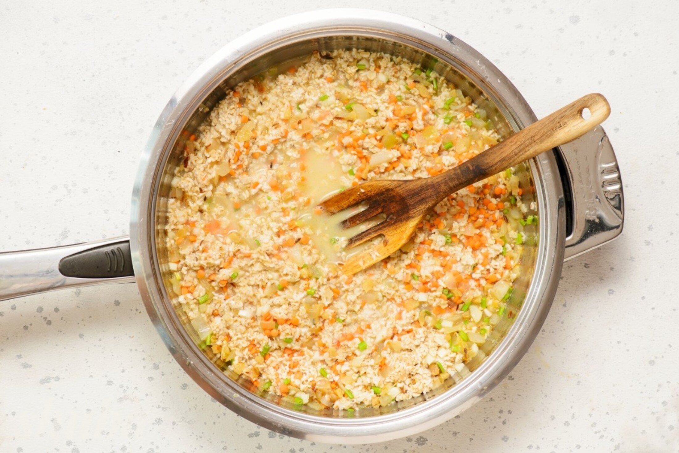 Промий сочевицю, додай у каструлю разом із водою і вівсяними пластівцями. Доведи до легкого кипіння і вари під кришкою 20 хвилин, періодично помішуючи.