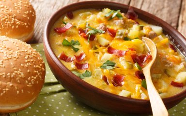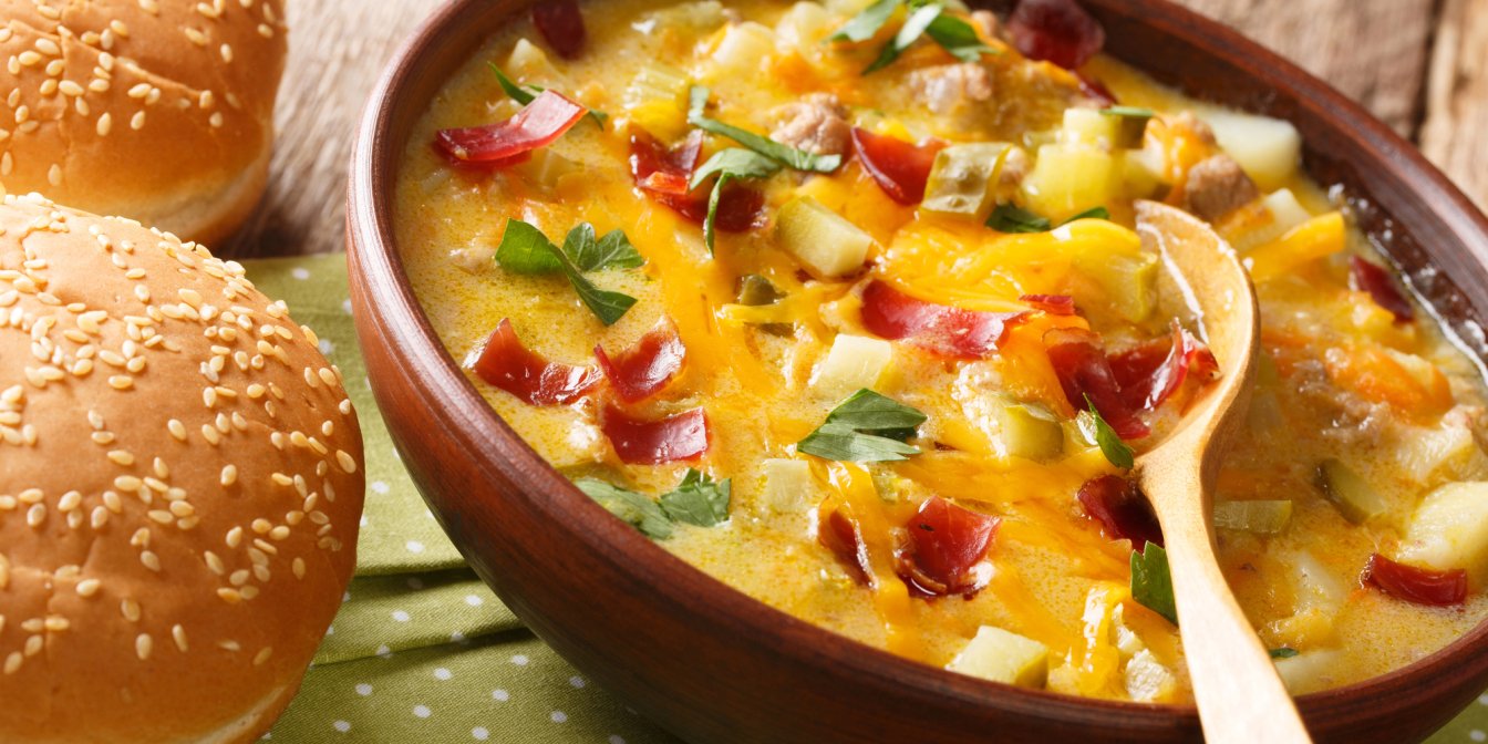 Суп «Чизбургер» можно отнести к фьюжн-блюдам, ведь компоненты чизбургера — говяжий фарш, бекон и сыр — превращаются в суп. А вот от первого блюда в нем лук, сельдерей и картофель. Этот сливочный сытный суп несомненно разнообразит обеденное меню!