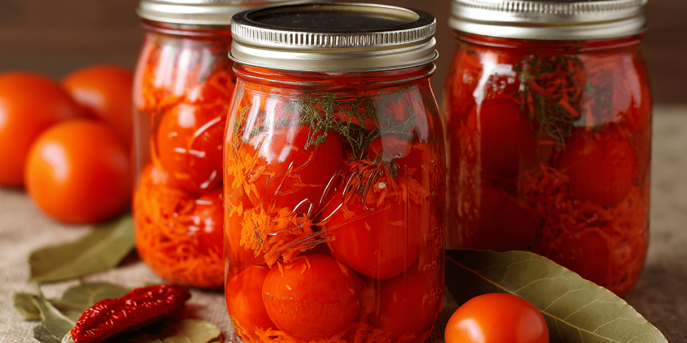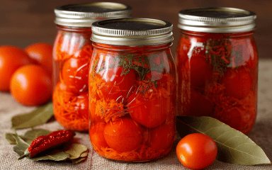 Плотно закрой банки крышками, храни салат из помидоры с морковью в сухом прохладном месте.