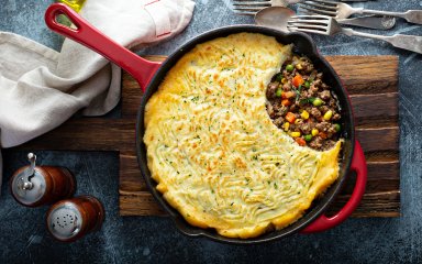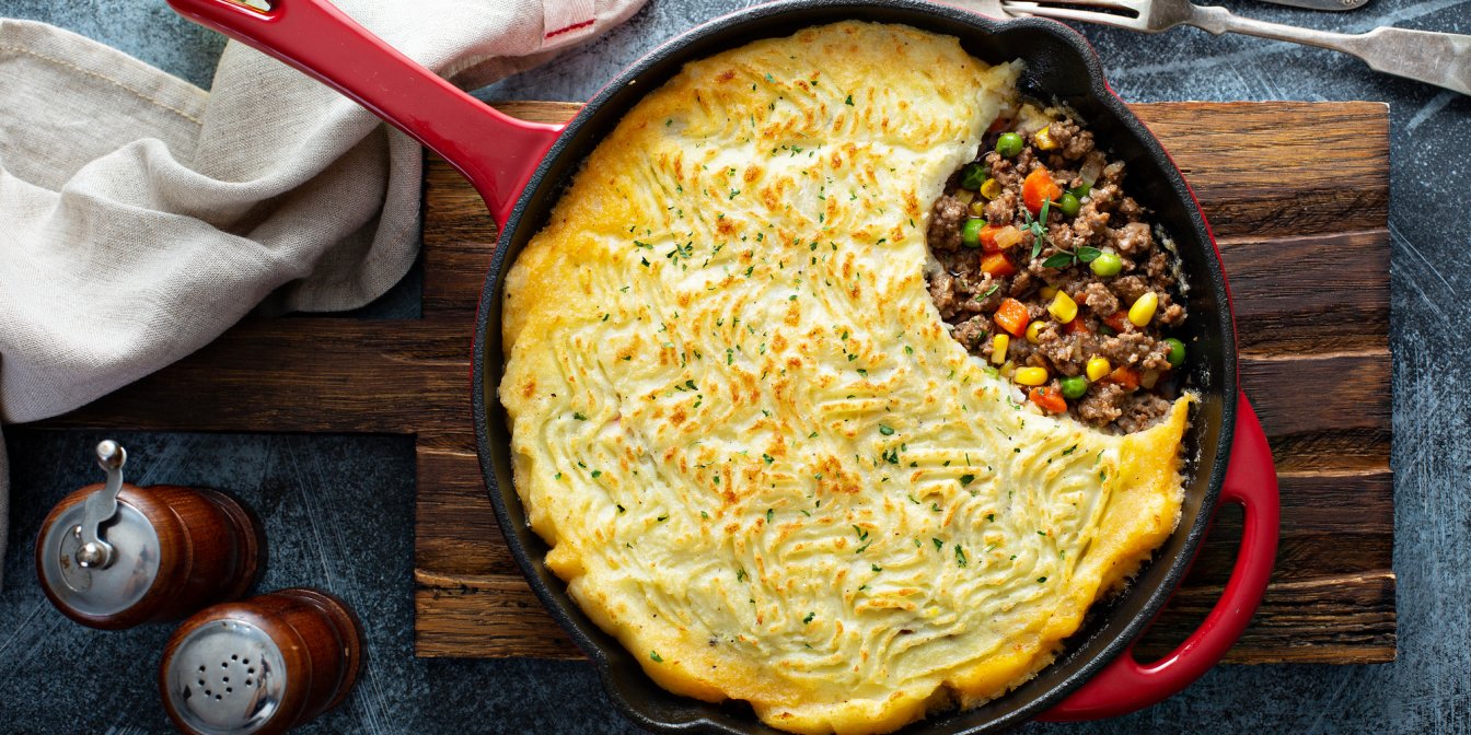 - Готовим пастуший пирог с говядиной, это классика. Возьми куриный фарш, он потушится быстрее. Чтобы сделать пирог полезнее, готовь его с добавлением тыквы или вообще без мяса — вегетарианский пастуший пирог с картошкой.