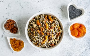 В готовую кашу добавьте мак, сухофрукты, орехи и хорошо перемешайте. Перед подачей на стол добавьте вино, смешанное с медом, и еще раз размешайте.