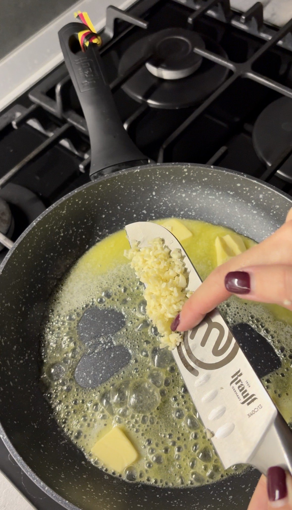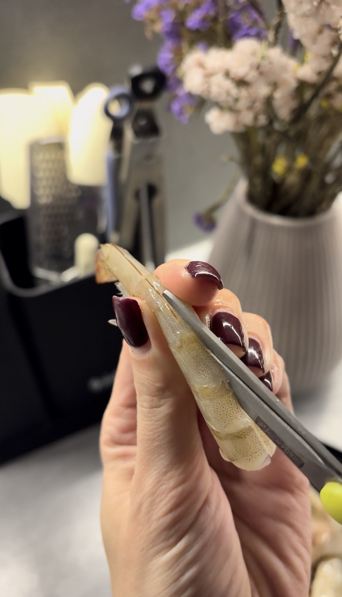 Перед тим як смажити, зроби надрізи на креветках.
