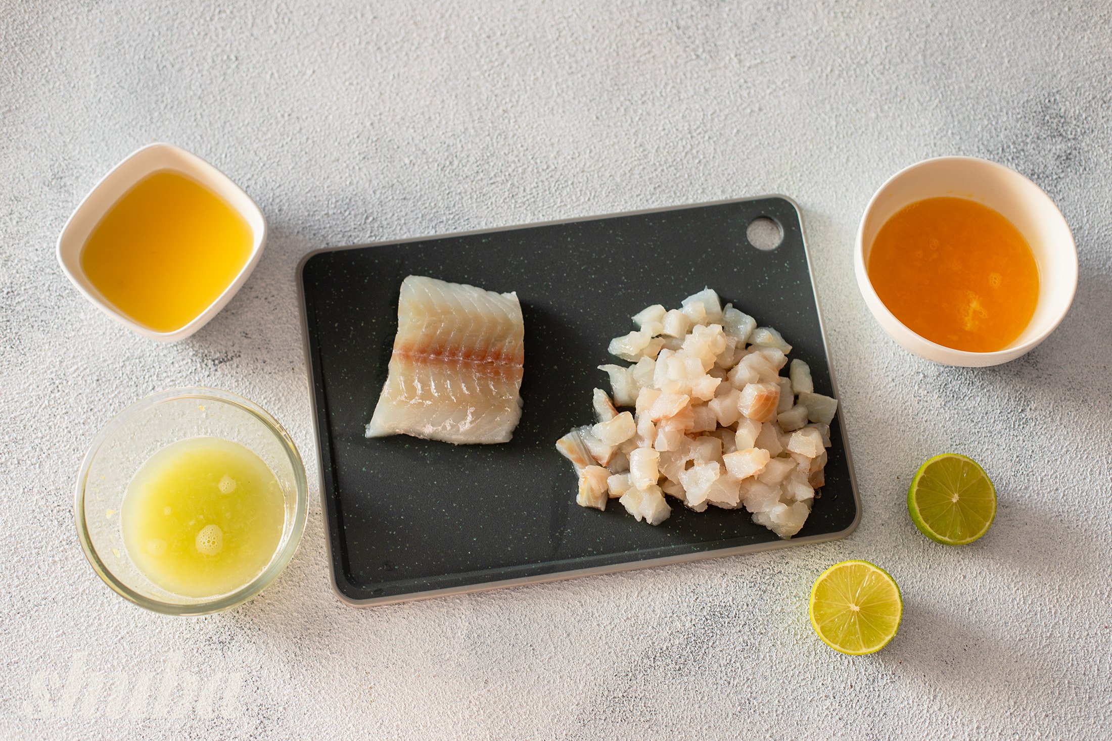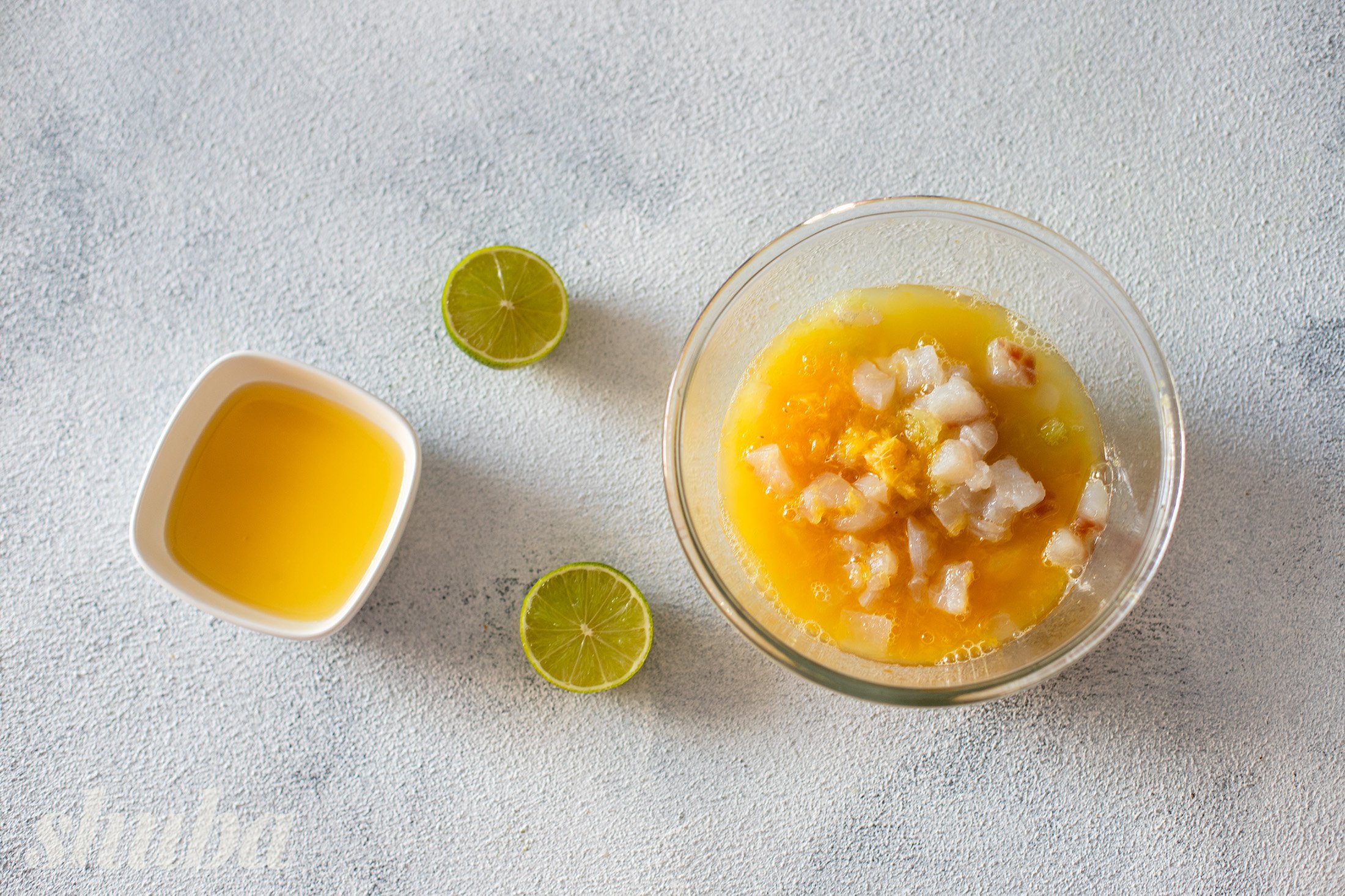 Переклади рибу в неметалеву миску, залий більшою частиною соку лайма та апельсина так, щоб він повністю покривав рибу. Перемішай 2–3 рази, накрий і постав у холодильник на 45–60 хв. Кожні 15 хв обережно перемішуй. Коли риба стане щільнішою і непрозорою, злий маринад.