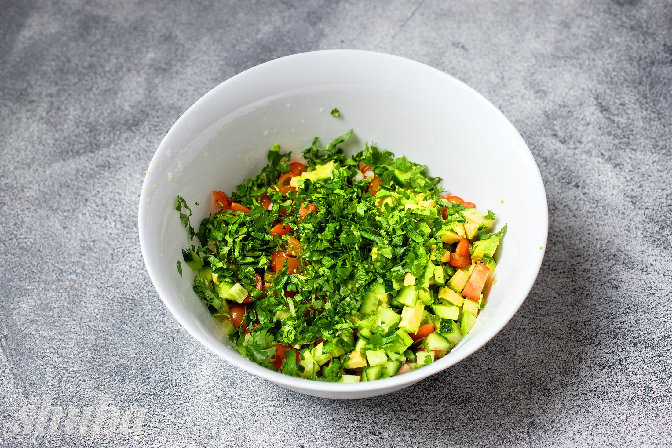 До риби додай овочі, цедру лайма, кінзу, сіль і перець. Влий решту соку лайма та апельсина, перемішай. За потреби додай ще трохи соку.