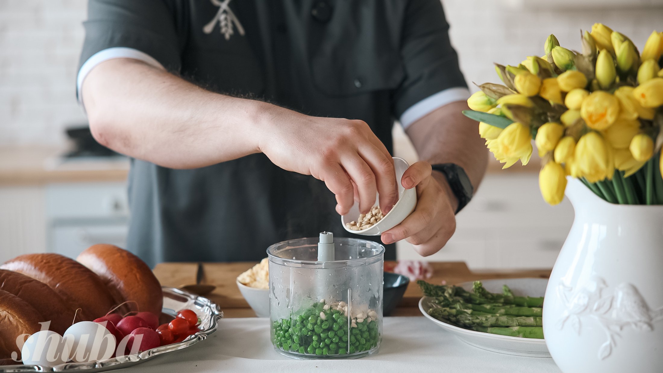 - У рецепті даємо два варіанти соусу. Це зелений песто-крем із зеленого горошку та смачний соус з яєць і редиски. Вибирай собі до смаку або готуй обидва для дегустації.